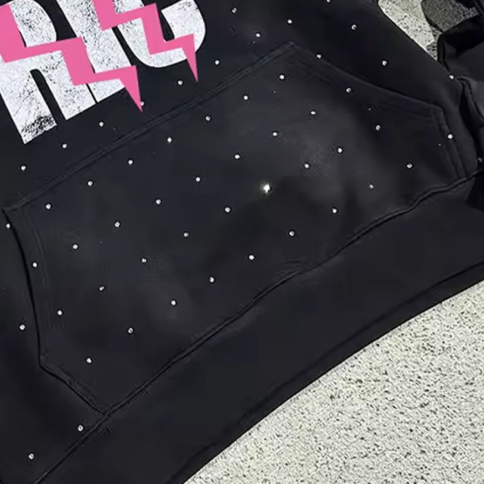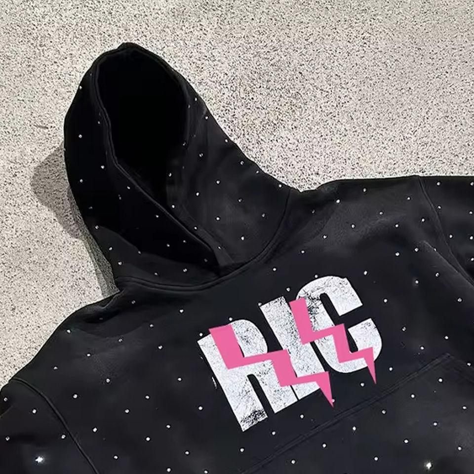 OEM เสื้อฮู้ดผ้าฝ้ายฟอกสีกรดสำหรับผู้ชายเสื้อสเวตเชิ้ตพิมพ์ลายไรน์สโตนโอเวอร์ไซส์
