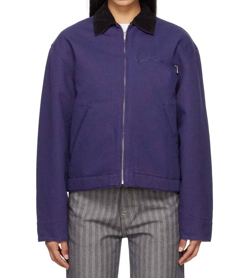 บริการ OEM เสื้อแจ็คเก็ตผ้าแคนวาสกันน้ำสีม่วงสไตล์วินเทจแบบพับได้สำหรับทำงาน เหมาะสำหรับทุกเพศ แจ็คเก็ตผ้าแคนวาสหนาน้ำหนักมากแบบซิป