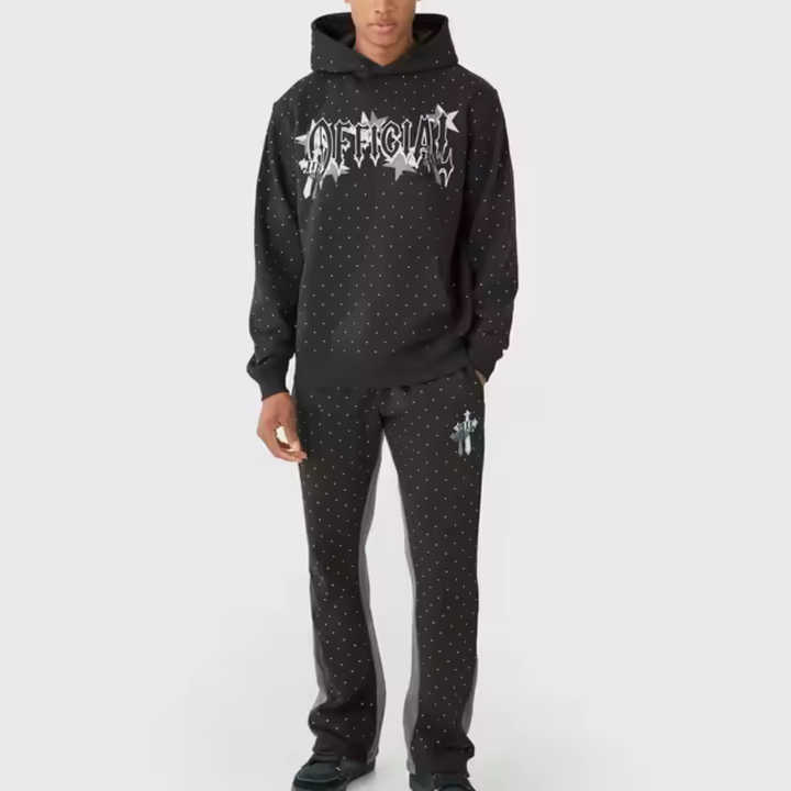 บริการ OEM ชุดวอร์มสตรีทแวร์ทรงปกติ ประดับคริสตัลทั่วตัว เสื้อฮู้ดดี้ลำลองและกางเกงจ็อกเกอร์สำหรับผู้ชาย ผ้าฝ้าย 100%