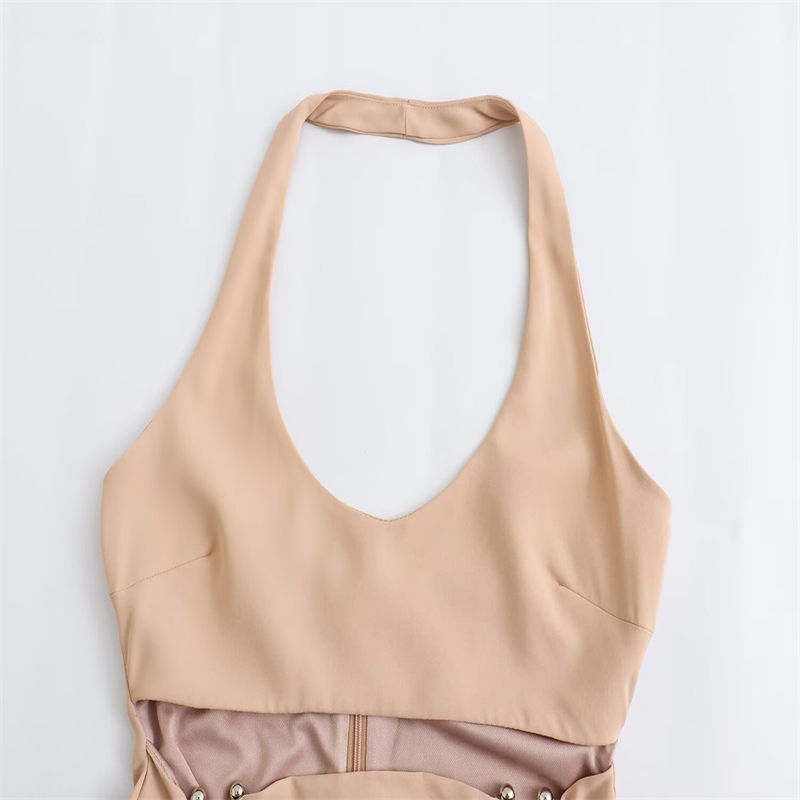 เดรสสายคล้องคอทรงหลวมสำหรับผู้หญิงชุดเดรสแบบเย็บติดเอวสูงทันสมัยสำหรับฤดูร้อนออกแบบโลโก้ได้ตามต้องการ