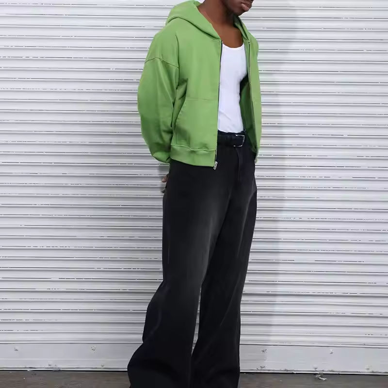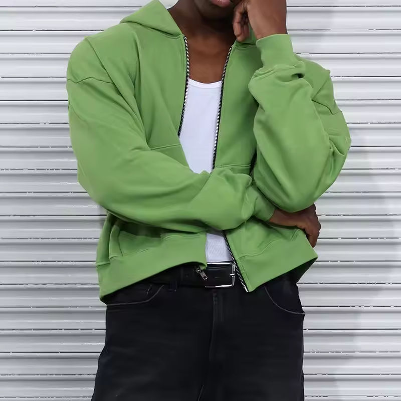 เสื้อฮู้ดดี้ทรงบ็อกซี่แบบครอป สตรีทแวร์ OEM สีเขียวล้วน ผ้าเฟรนช์เทอร์รี่เนื้อหนา ทรงหลวมไหล่ตก ทรงบ็อกซี่ ใส่สบาย แบบซิป สำหรับผู้ชาย