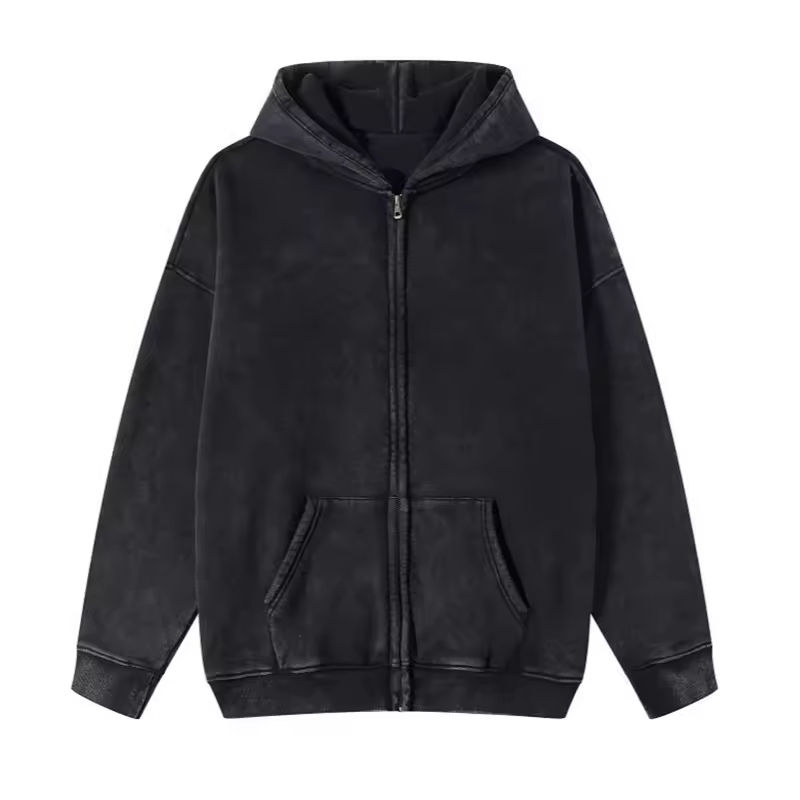 เสื้อฮู้ดดี้ผู้ชาย OEM Streetwear ผ้าฝ้าย 100% หนานุ่ม สำหรับฤดูหนาว พิมพ์ลายตามสั่ง ซิปเต็มตัว ล้างสีแบบ Acid Wash สไตล์วินเทจ ปักโลโก้ตามสั่ง