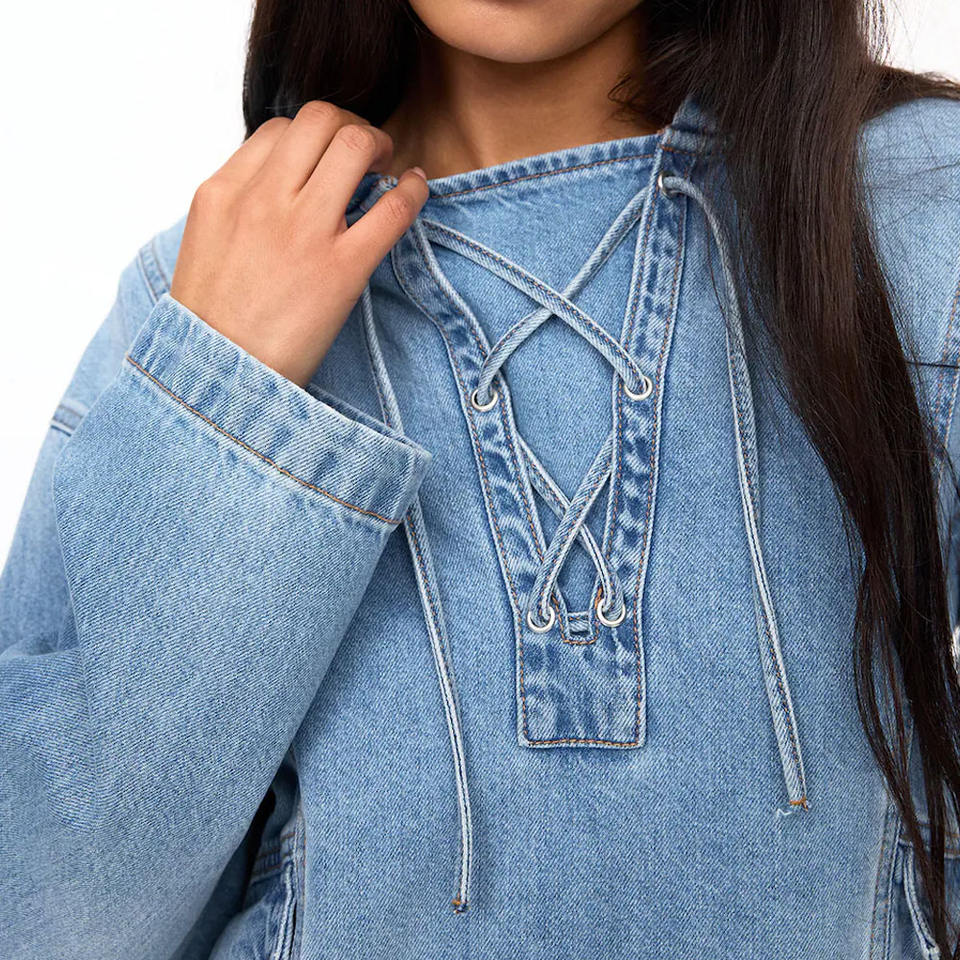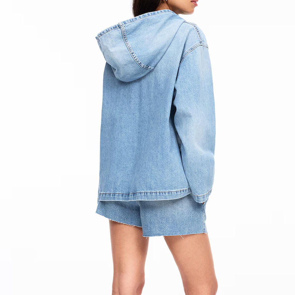 ชุดเสื้อผ้าเดนิมสำหรับผู้หญิงชุดเสื้อแจ็คเก็ตและกระโปรงผ้ายีนส์ซักเบาสบายๆมีสไตล์งาน OEM