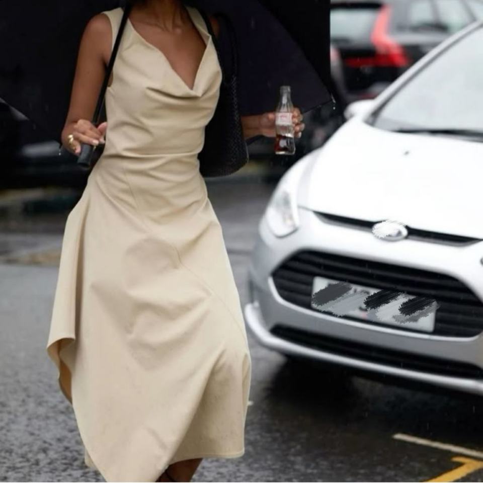 เดรสยาวปานกลางทรงสวยหรูสไตล์ใหม่สำหรับฤดูร้อน คอเสื้อแบบจับจีบ ผ่าข้าง ทรงเข้ารูป เปิดหลัง เหมาะสำหรับงานปาร์ตี้