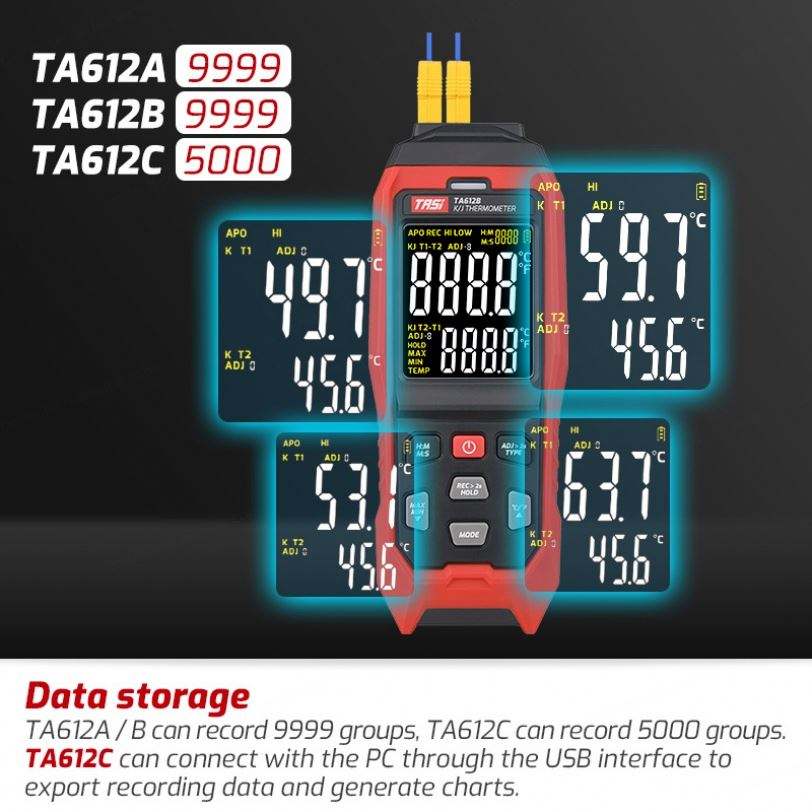 เทอร์โมมิเตอร์ OEM TASI TA612A K/J พร้อมเครื่องบันทึกข้อมูล 9999 กลุ่ม เทอร์โมคัปเปิลพลาสติก รองรับการผลิตแบบ ODM