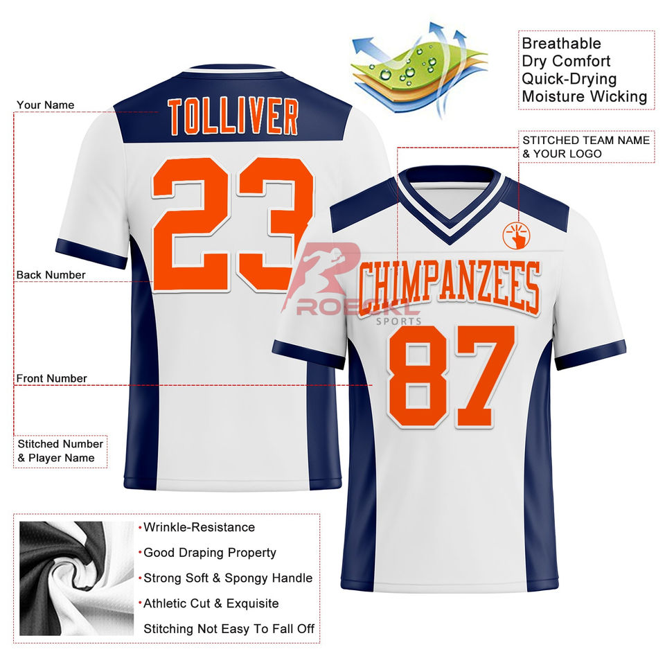 เสื้อเจอร์ซีย์อเมริกันฟุตบอลขายดีพร้อมโลโก้ตามสั่งสีขาวส้มกรมท่าตาข่ายแขนสั้นของแท้