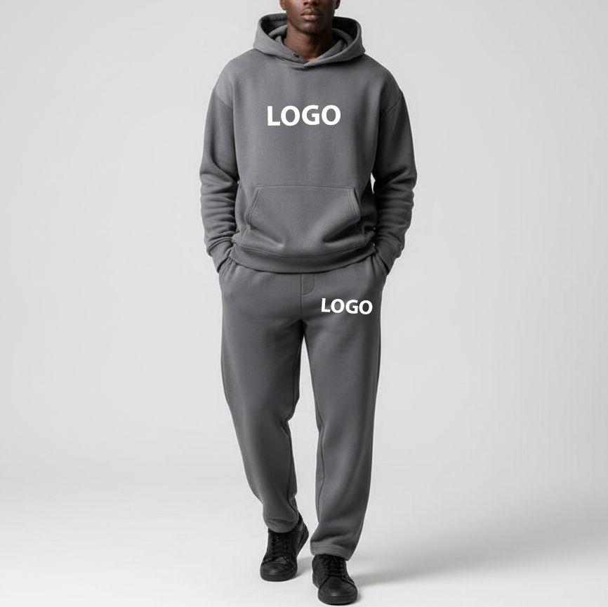 OEM ชุดวอร์มผ้าคอตตอนแบบสวมหัว, ชุดเสื้อผ้า2ชิ้นโอเวอร์ไซส์ทรงหลวมพิมพ์ลายสกรีน