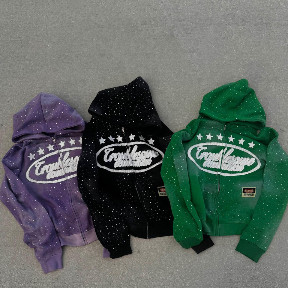 เสื้อฮู้ดดี้สตรีทแวร์แบบมีซิป แบรนด์ OEM สหรัฐอเมริกา ไม่เสียภาษี ผ้าเฟรนช์เทอร์รี่หนานุ่ม ทรงโอเวอร์ไซส์ แต่งคริสตัล ลุควินเทจ ย้อมสีเอซิด ลุคทำเก่า
