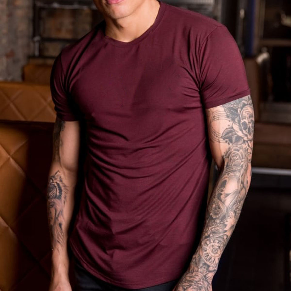 เสื้อยืดผู้ชายทรงสลิมฟิต คอตตอน 95% ผสมอีลาสเทน 5% ชายเสื้อโค้งยาว คอกลม เหมาะสำหรับออกกำลังกาย ฟิตเนส ขายส่ง OEM