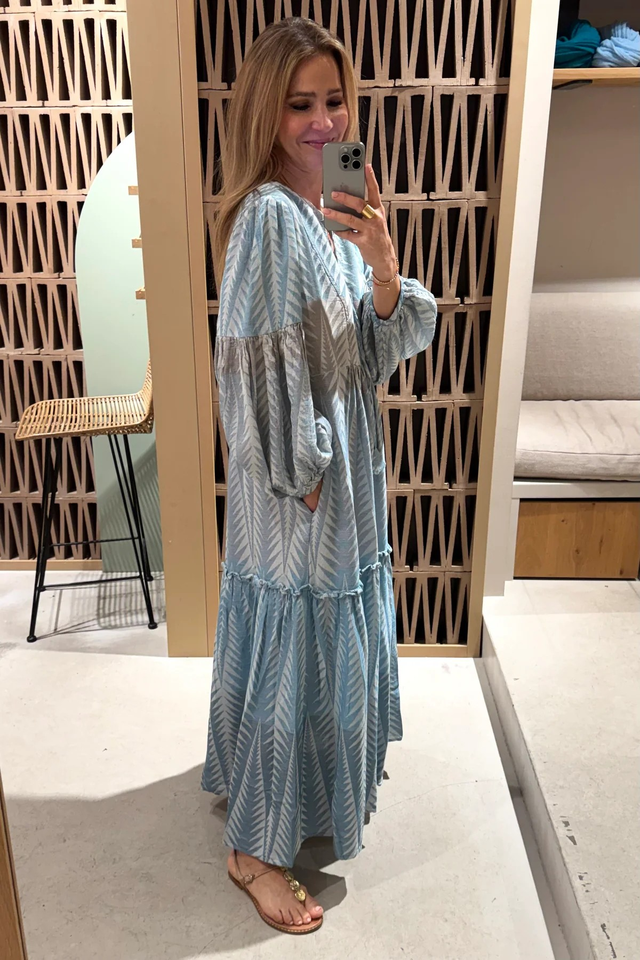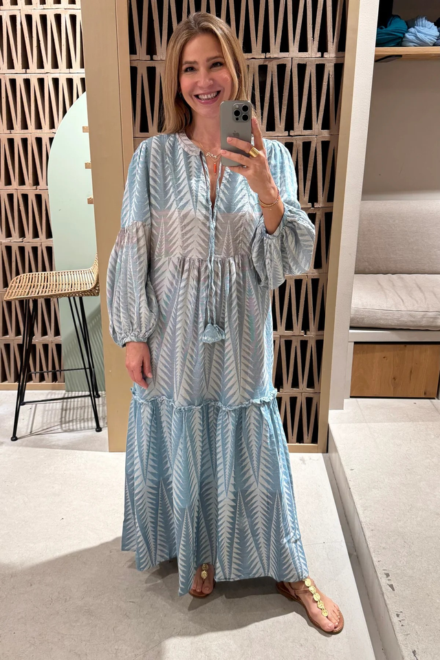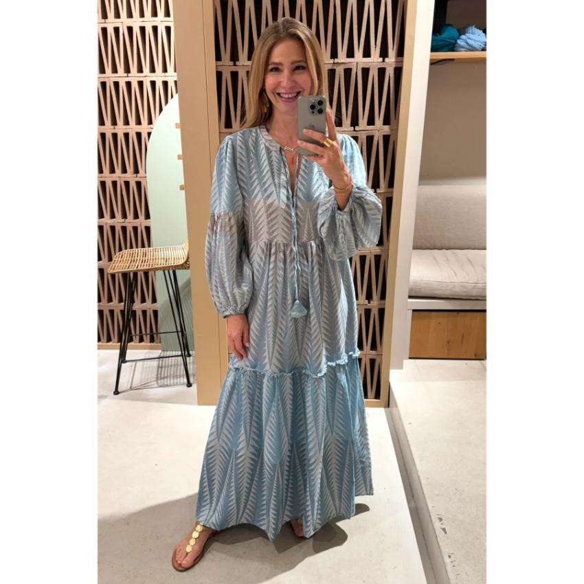 เดรสยาวโบฮีเมียนพิมพ์ลายสีน้ำเงินสำหรับผู้หญิง ขายส่งแบบ OEM แขน 3/4 ทรงหลวม ผ้าฝ้ายถักประดับพู่ เหมาะสำหรับใส่ไปเที่ยวทะเลในช่วงฤดูร้อน