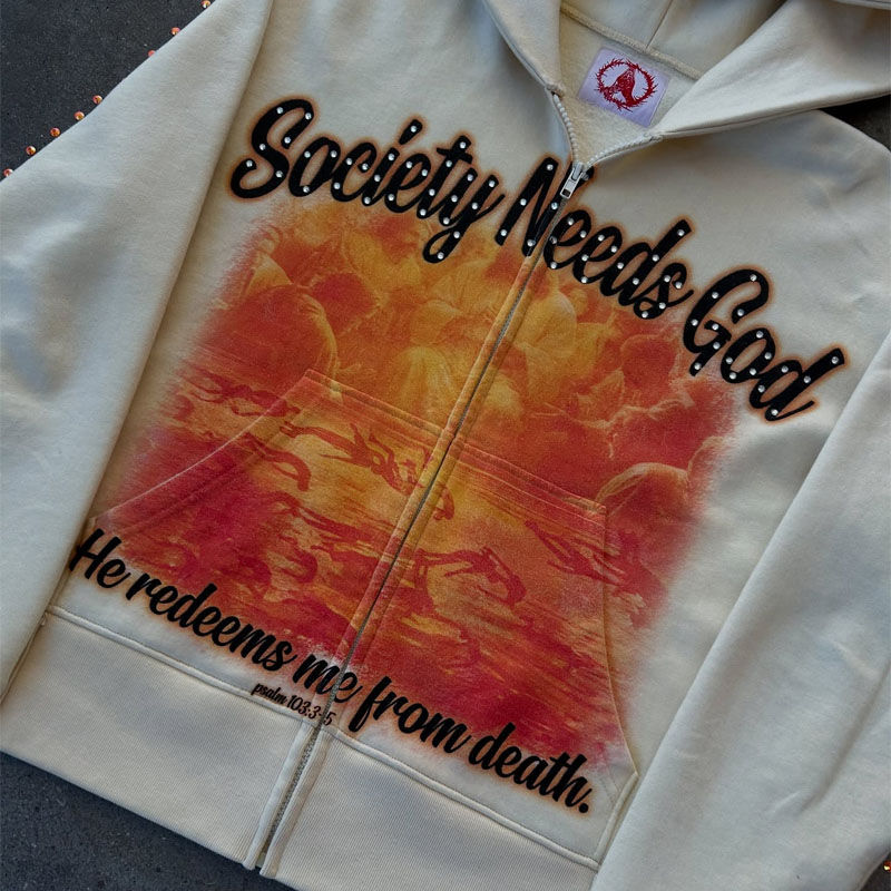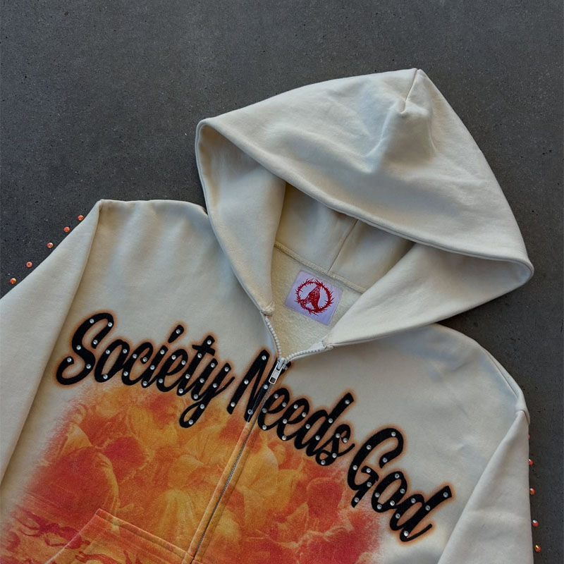 เสื้อมีฮู้ดผู้ชายปักลายตัวอักษรประดับพลอยเทียมมีซิปรูดพิมพ์ดิจิตอลแบบกำหนดเอง