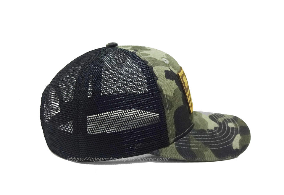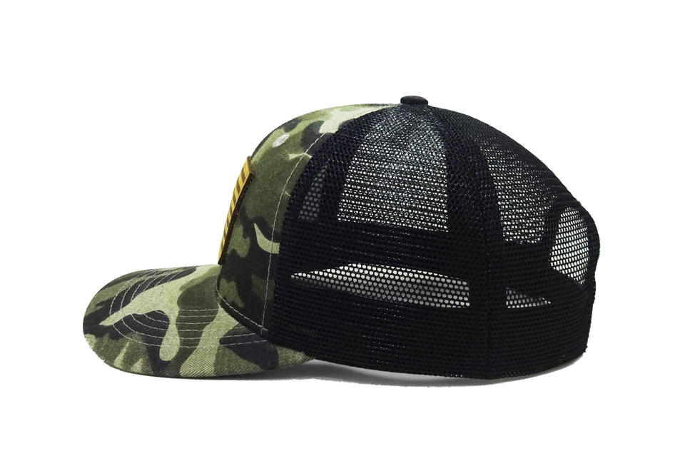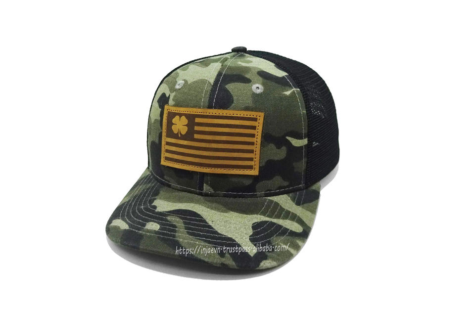 หมวกสแนปแบ็กลายพรางพร้อมแผ่นหนังพิมพ์ลาย6แผงด้านหลังตาข่ายระบายอากาศสไตล์ทรูเกอร์ออกแบบได้ตามต้องการจากโรงงาน