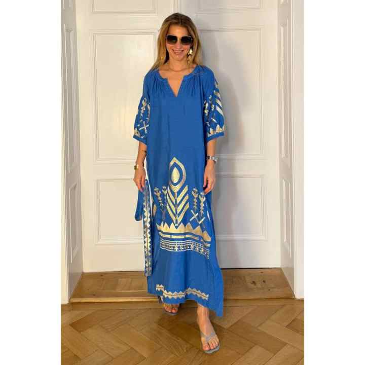 เดรสยาวทรงปล่อยสไตล์โบฮีเมียนสำหรับผู้หญิง คอวี แขนพอง แต่งพู่ ลายพิมพ์ฟอยล์สีน้ำเงินทอง ผลิตจากผ้าฝ้าย 100% เป็นมิตรต่อสิ่งแวดล้อม ขายส่งแบบ OEM