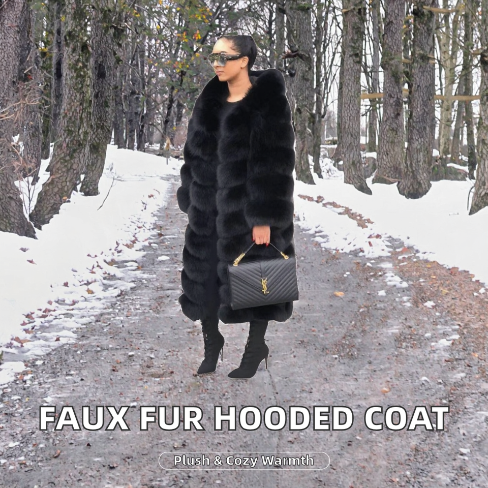 OEM Wholesale Women's Vintage Plaid Embossed Anti-shrink Faux Fox Fur Coat Winter Long Thick Fluffy Hooded Jacket Plain Dyed