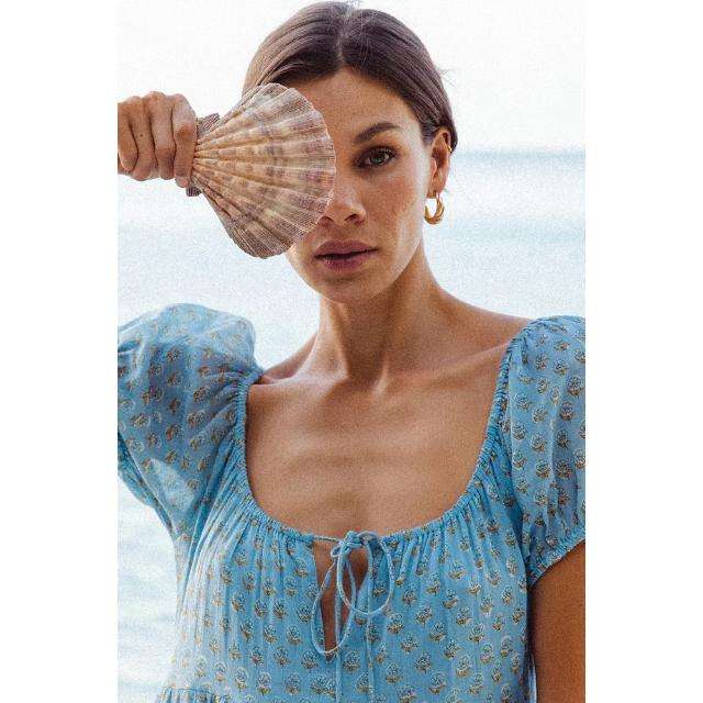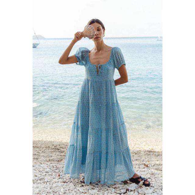 เดรสยาวพิมพ์ลายดอกไม้สไตล์โบฮีเมียนสำหรับผู้หญิง คอวี แขนพอง ทรงปกติ ผ้าฝ้าย 100% ลายมัดย้อม เหมาะสำหรับฤดูร้อนและวันพักผ่อนริมชายหาด