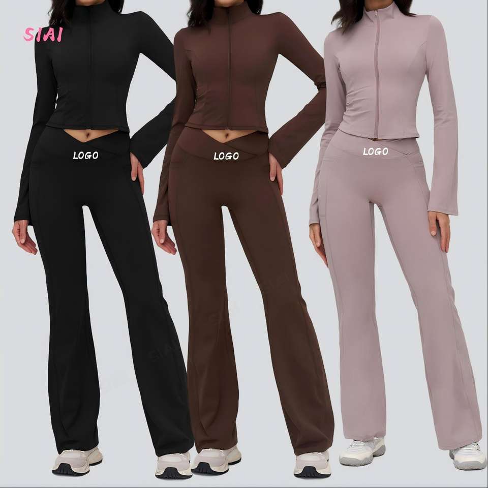 ชุดออกกำลังกายสำหรับผู้หญิงไซส์ใหญ่ ระบายอากาศได้ดี เสื้อแจ็คเก็ตแขนยาวสำหรับออกกำลังกาย กางเกงขายาวทรงกว้าง ชุดโยคะ ชุดกีฬา พร้อมโลโก้ด้านหน้า