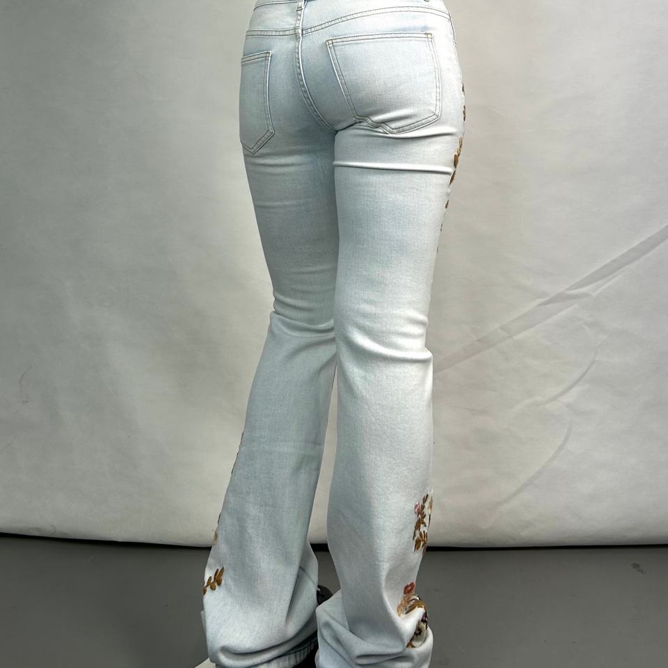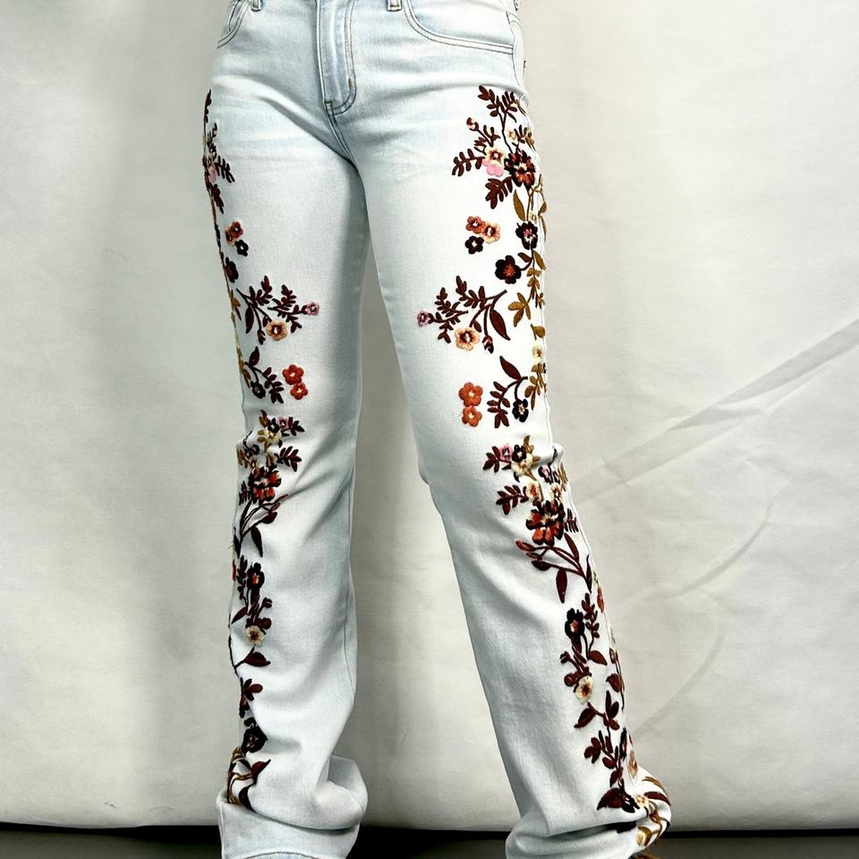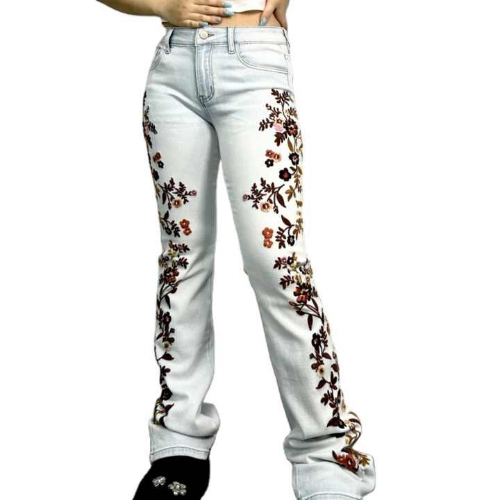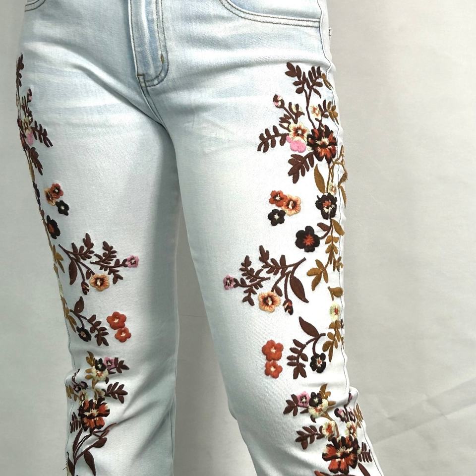 กางเกงยีนส์ลายดอกไม้สำหรับผู้หญิง OEM กางเกงเดนิมปักลายตามสั่ง กางเกงลำลองทรงสกินนี่แบบซัก