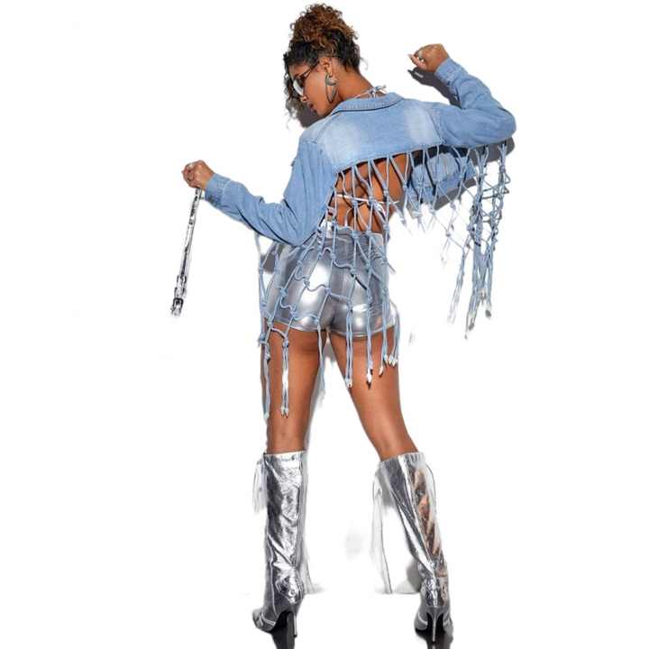 เสื้อแจ็คเก็ตยีนส์คาวบอยแฟชั่นสำหรับผู้หญิง OEM พรีเมียม แขนยาว เปิดหลัง แต่งชายครุยตาข่าย