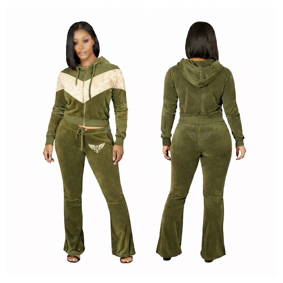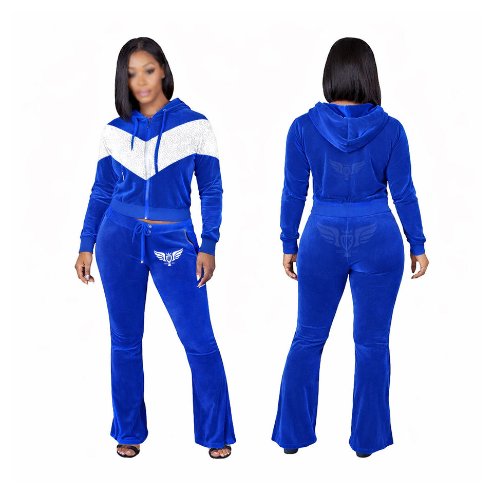 ชุดวอร์มกำมะหยี่สีแดงประดับคริสตัลสำหรับผู้หญิง แบรนด์ OEM ประกอบด้วยเสื้อแจ็คเก็ตมีฮู้ดแบบซิป และกางเกงขาบาน