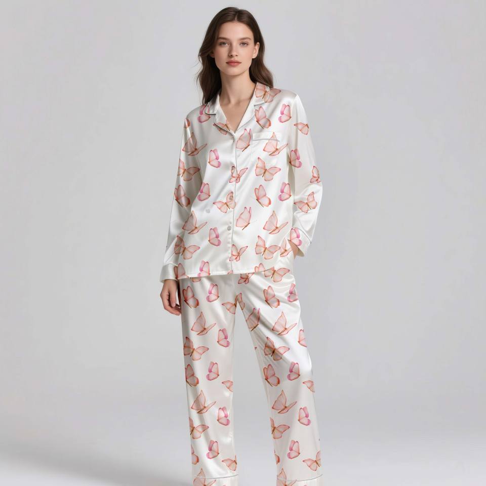 ชุดนอนผ้าไหมซาตินสำหรับผู้หญิง OEM ชุดนอนสั่งทำพิเศษ แขนยาวและกางเกงขายาว คุณภาพสูง ระบายอากาศได้ดี ใช้ได้ทุกฤดู