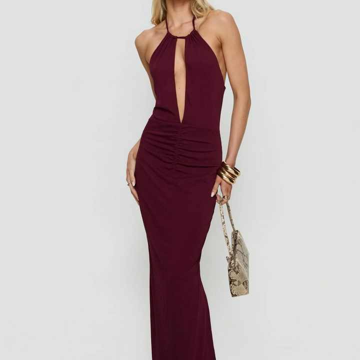เดรสยาวทรงเข้ารูปสำหรับผู้หญิง ดีไซน์หรูหราสำหรับฤดูร้อน คอวีลึก เปิดหลัง สายคล้องคอ เหมาะสำหรับงานปาร์ตี้กลางคืน ผ้ารัดรูปทรงสวย