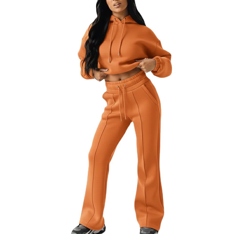 ชุดวอร์มผู้หญิงสไตล์สตรีทสำหรับฤดูหนาว ผ้าฝ้าย 100% ระบายอากาศได้ดี เสื้อฮู้ดแบบสวมหัวทรงโอเวอร์ไซส์ กางเกงขายาวเอวสูงทรงบาน