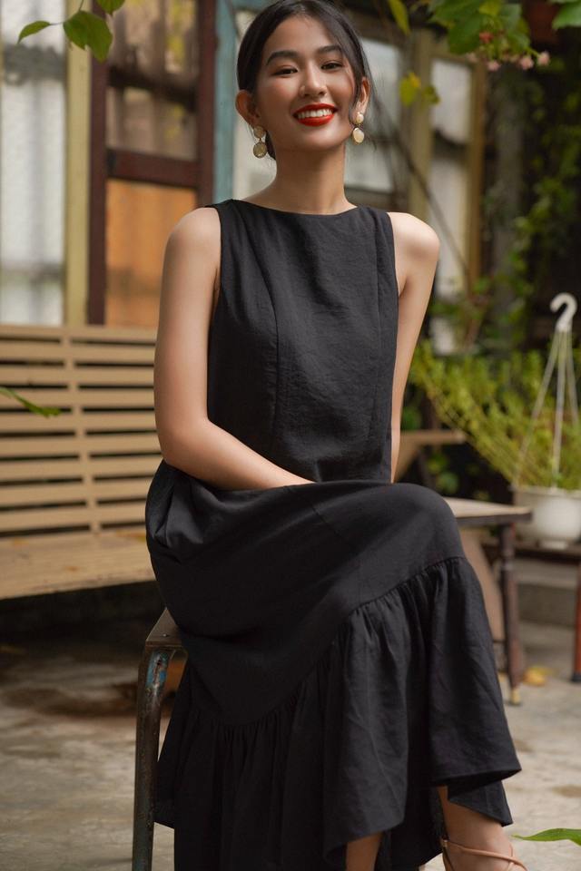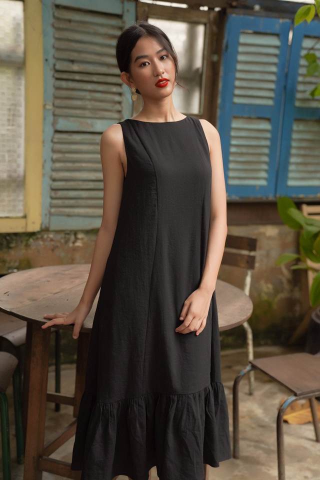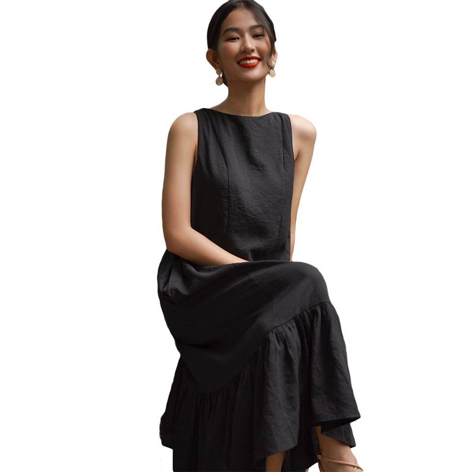 OEM ชุดเดรสผ้าฝ้ายผสมสำหรับผู้หญิง, ชุดเดรสสตรีทรงพอดีตัวแขนกุดยาวมิดิแต่งระบายด้านล่างทำจากเวียดนาม
