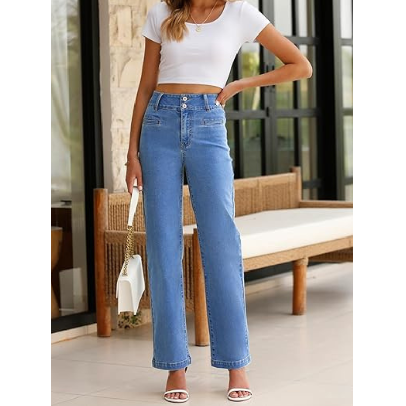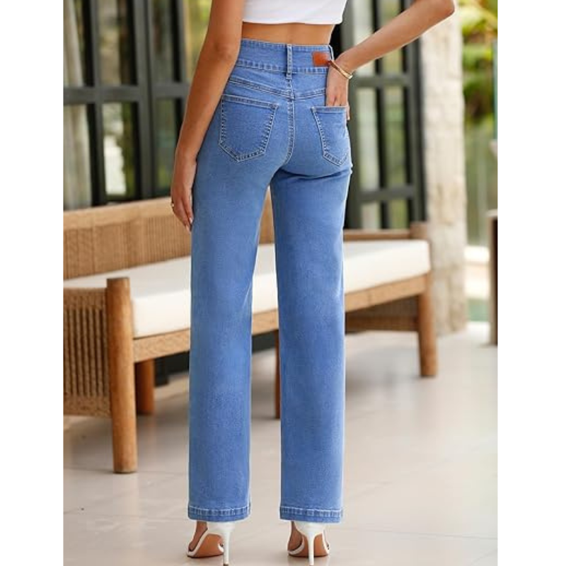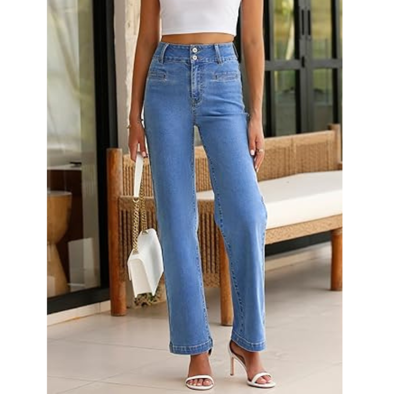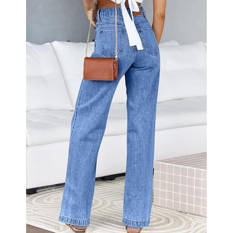 OEM กางเกงยีนส์แฟชั่นสำหรับผู้หญิง, กางเกงยีนส์สีน้ำเงินขากว้างเอวกลางพร้อมกระดุมและซิปปิด