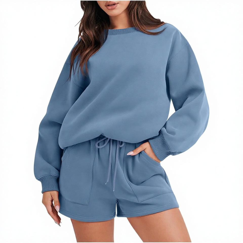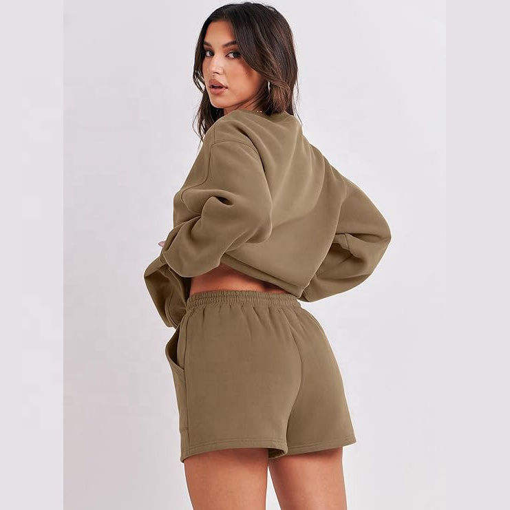 เสื้อสเวตเชิ้ตคอกลมฮิปฮอปสำหรับผู้หญิง OEM ผ้าฝ้าย 100% สีพื้น ชุดเซ็ต 2 ชิ้น กางเกงขาสั้นถักสำหรับฤดูหนาว พิมพ์ลายสกรีน
