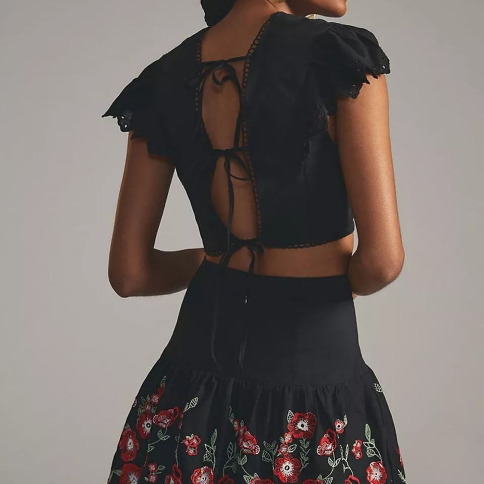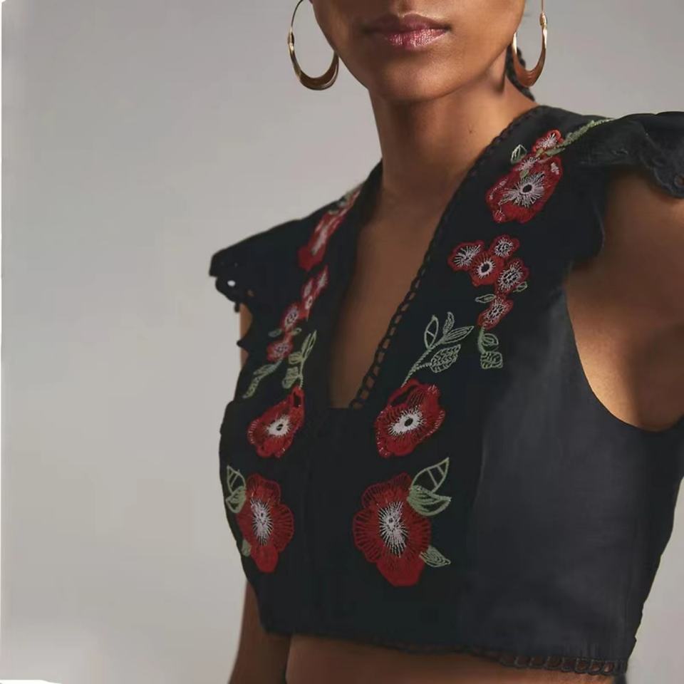 ชุดผ้าลินินฤดูร้อนสำหรับผู้หญิง OEM ลายปักดอกไม้ ชุดเซ็ตสองชิ้น เสื้อและกระโปรง ความยาวเหนือเข่า ตกแต่งด้วยลูกไม้ ขายดี เสื้อครอปสั้น
