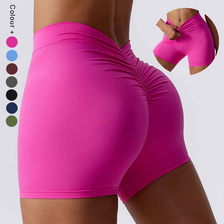 กางเกงโยคะออกกำลังกายขาสั้นเอวสูงสำหรับผู้หญิงเอวสูงกางเกงขี่จักรยานสำหรับออกกำลังกายเล่นกีฬาวิ่งออกกำลังกายแบบเซ็กซี่ทรง V ยืดหยุ่น OEM