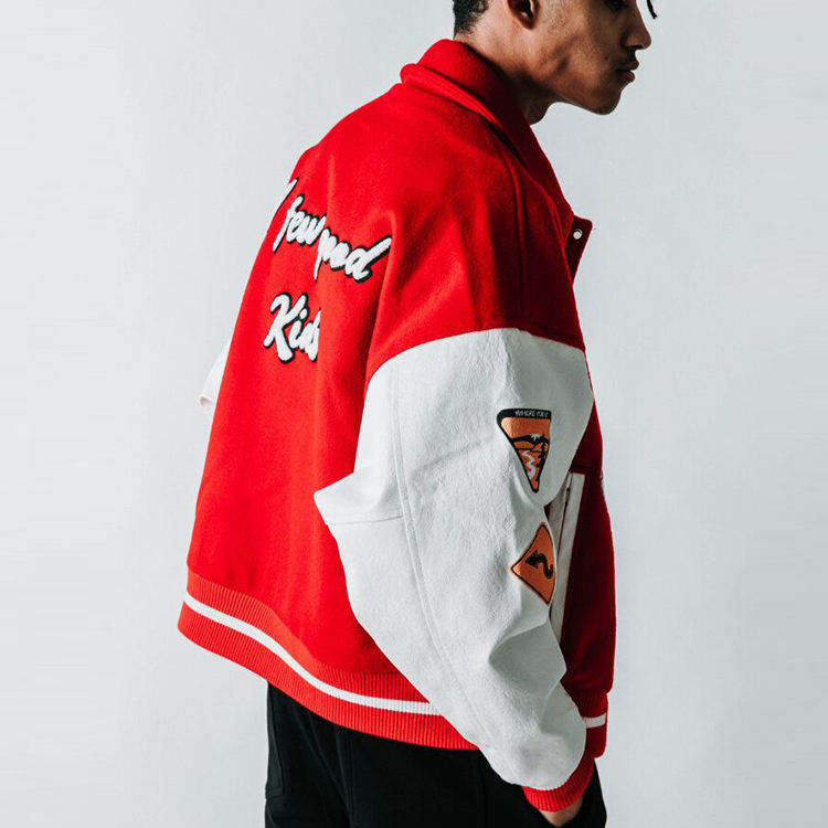 แจ็กเก็ตเบสบอลวิทยาลัยขนสัตว์เสื้อแจ็คเก็ตแขนหนังดีไซน์ตามสั่ง