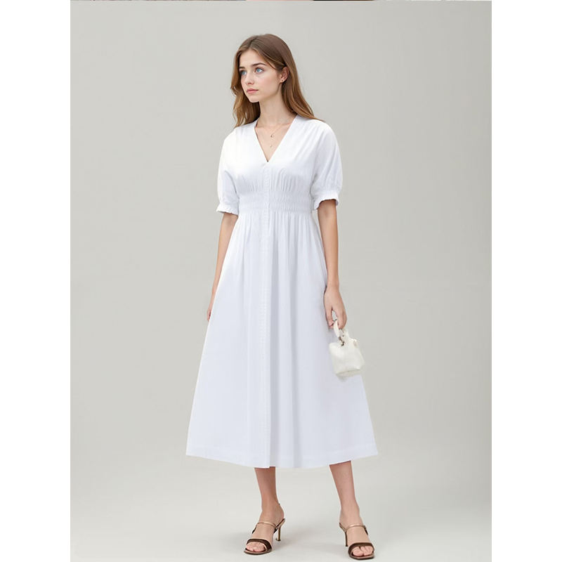 เดรสทรงเอไลน์เอวสูงสไตล์วินเทจ แขนสั้น คอวี ความยาวปานกลาง ผ้าฝ้าย 100% คุณภาพสูง สไตล์ลำลอง ผลิตโดย OEM แบบสั่งทำพิเศษ