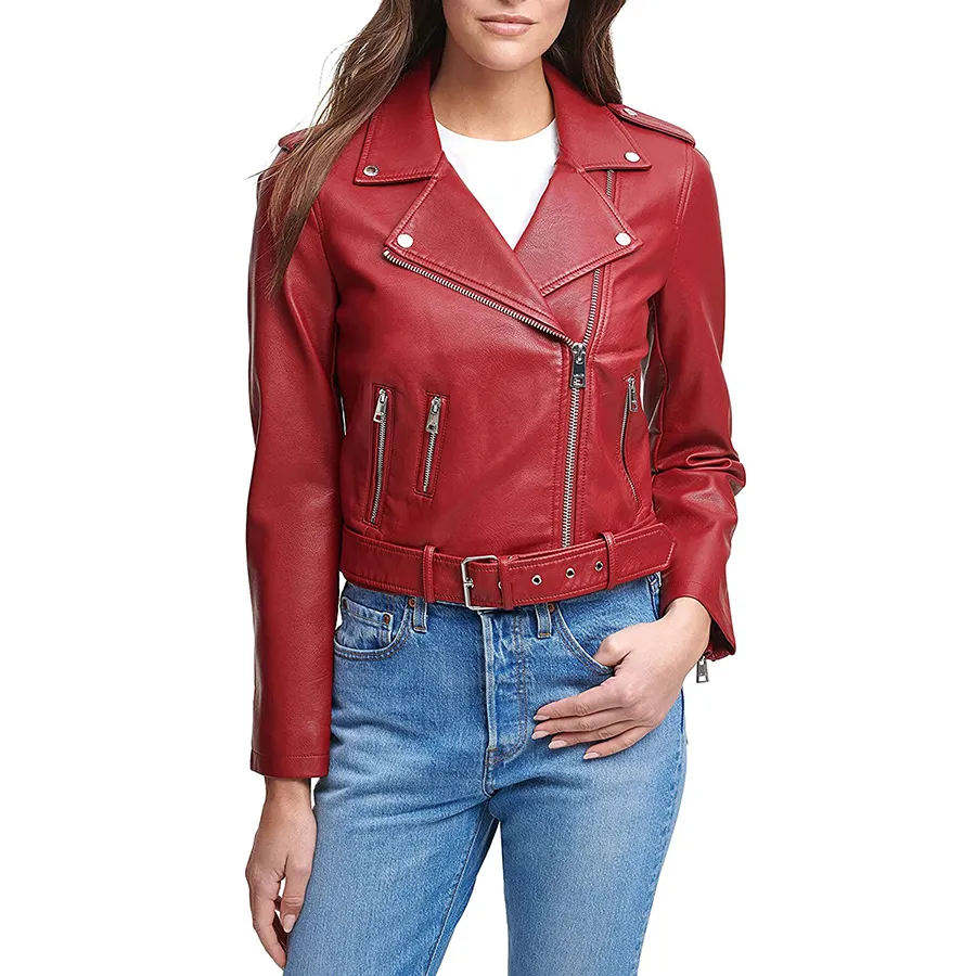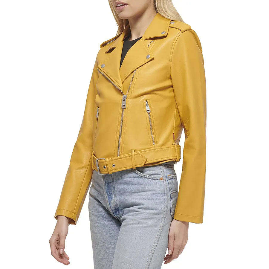 แจ็คเก็ตหนังแท้สีเหลืองพรีเมียมสำหรับผู้หญิง รุ่น OEM แฟชั่นปี 2026 แจ็คเก็ตหนังสำหรับขี่มอเตอร์ไซค์ คุณภาพพรีเมียมสูงสุด แจ็คเก็ตหนังสำหรับผู้หญิง