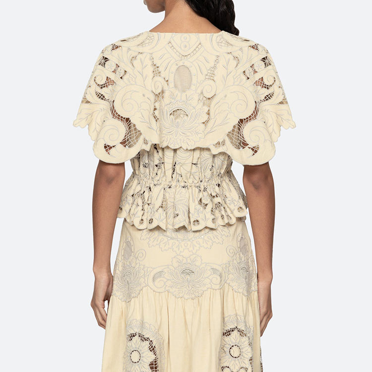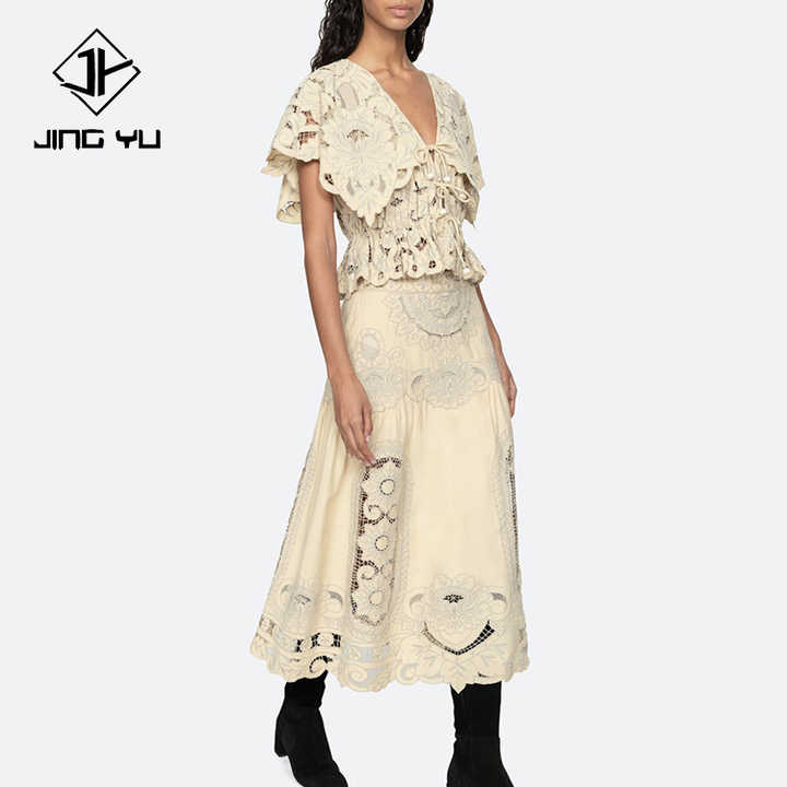 ชุดเดรสผ้าลินินคอตตอนหรูหราแบบสองชิ้น พร้อมงานปักลายดอกไม้แบบ OEM ตามสั่ง และชุดเสื้อและเดรสสุดหรู