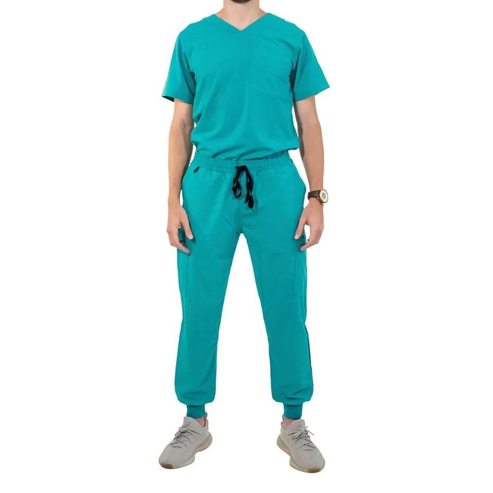ชุดเครื่องแบบโรงพยาบาลแขนสั้นคอวีสำหรับผู้ชายชุดดูแลสุขภาพโรงพยาบาลออกแบบโลโก้ได้ตามต้องการ