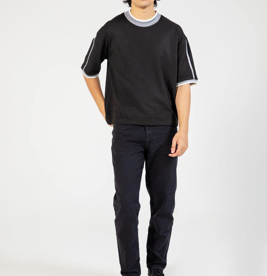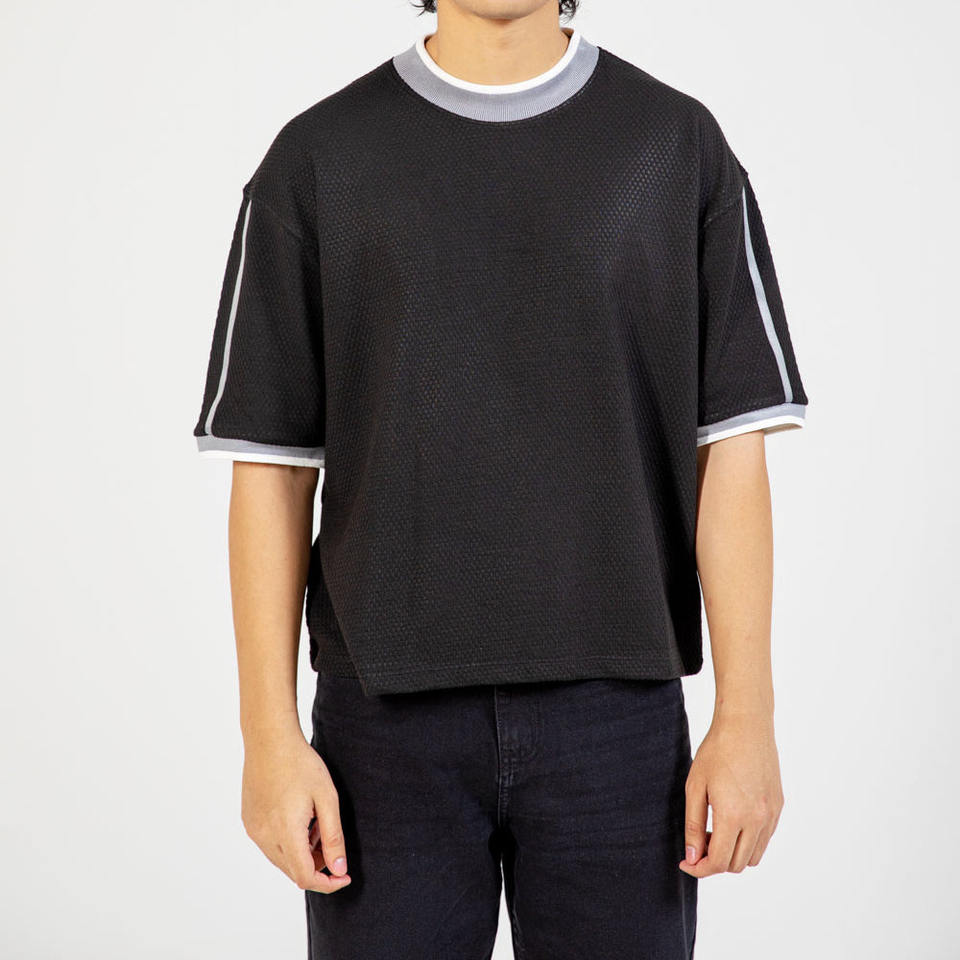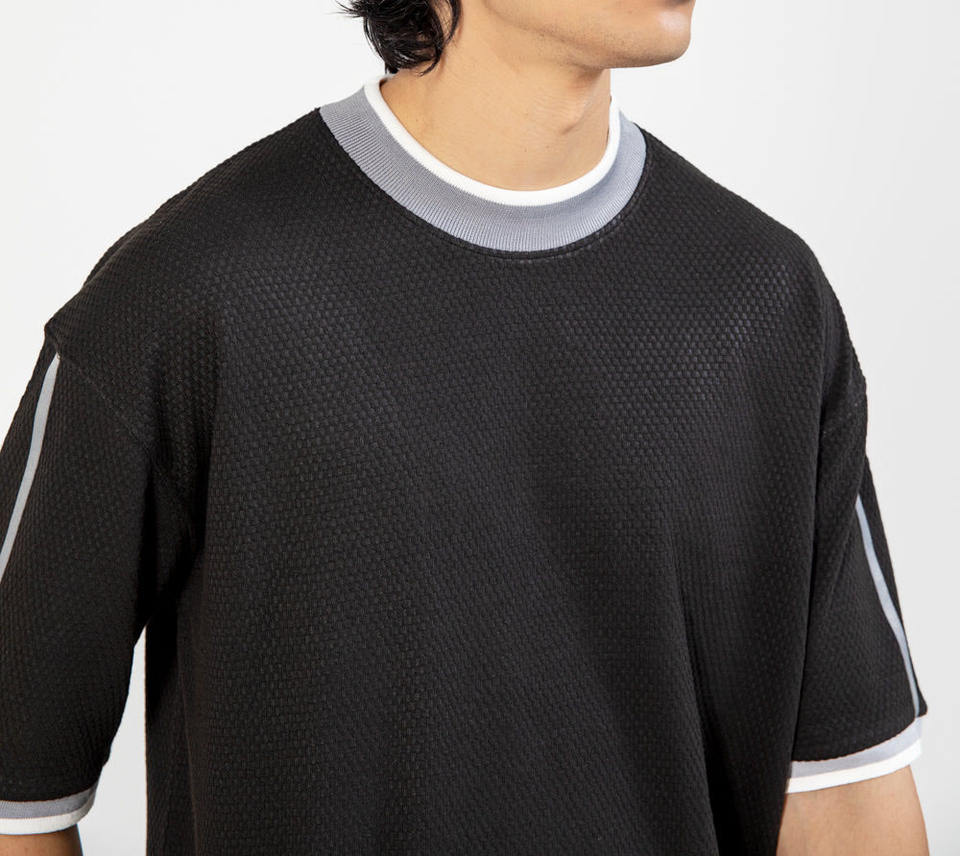 เสื้อยืดสีดำเรียบง่าย พิมพ์ลายปักโลโก้ OEM ตามสั่ง เนื้อผ้ามีเท็กซ์เจอร์ ระบายอากาศได้ดี เสื้อยืดกีฬาสีดำ สไตล์โมเดิร์น