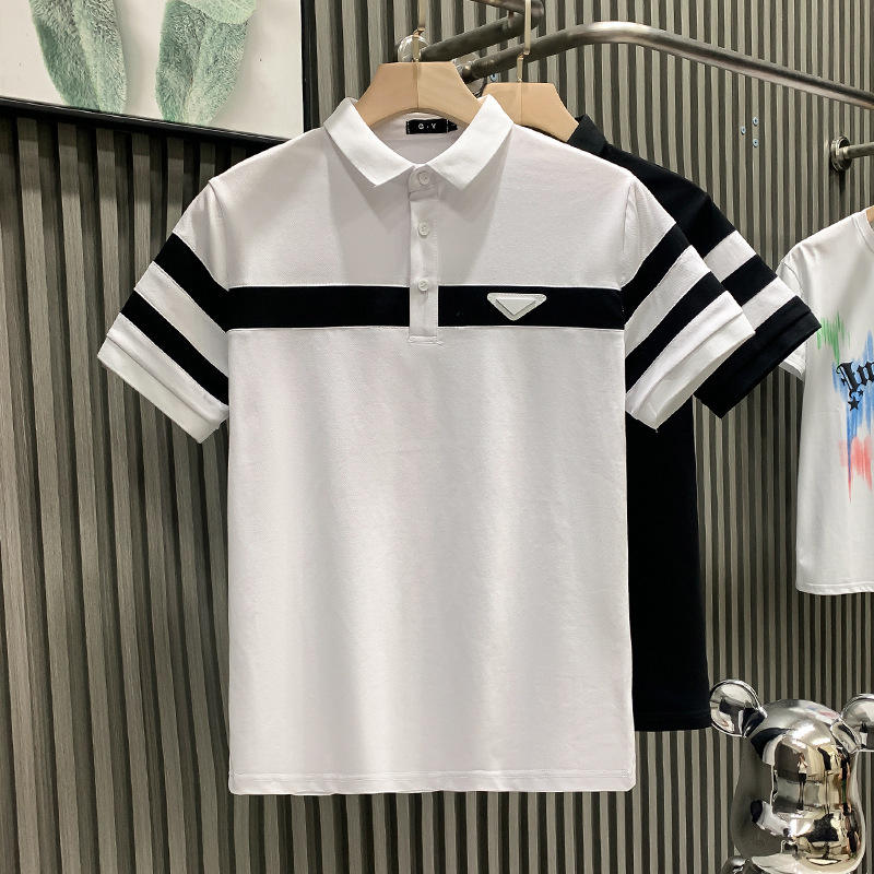 เสื้อโปโลแขนสั้นสำหรับผู้ชายคอปกลายทางสีดำและสีขาวโลโก้แบบสั่งทำ