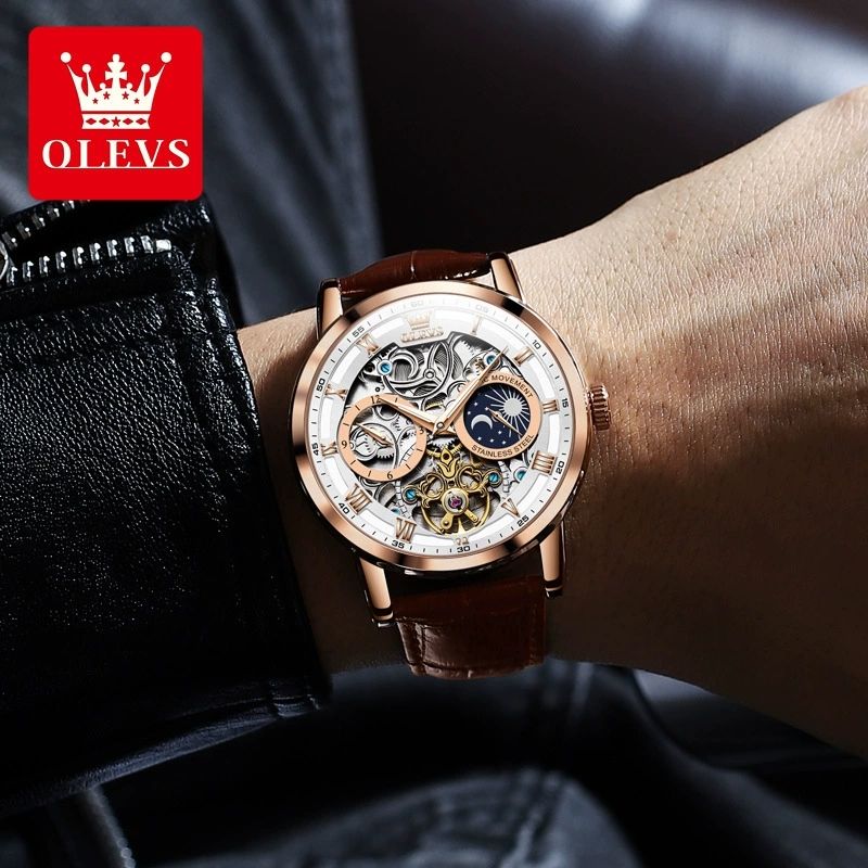 นาฬิกาข้อมือผู้ชาย OLVES 6670 แฟชั่น ระบบอัตโนมัติเต็มรูปแบบ โครงสร้างกลไกแบบกลวง หน้าปัดทรงรี สีโรสโกลด์ สายหนัง ดีไซน์โลโก้ 3 มิติ กันน้ำ พร้อมเข็มบอกเวลา