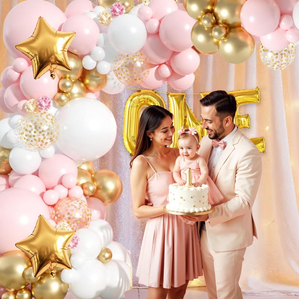 ชุดตกแต่งวันเกิด ONE Happy Birthday Combo Pack 58 ชิ้น ชุดลูกโป่งสีชมพู ทอง ขาว พร้อมป้ายฟอยล์ไฟ LED หนึ่งอัน