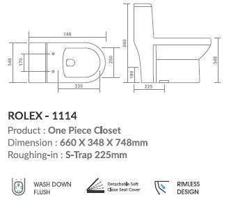 โถสุขภัณฑ์แบบชิ้นเดียวพร้อมท่อน้ำทิ้งแบบ S-Trap ขนาด 225 มม. และขนาด 660x348x748 มม. ระบบชำระล้างแบบ Wash Down ดีไซน์ไร้ขอบ