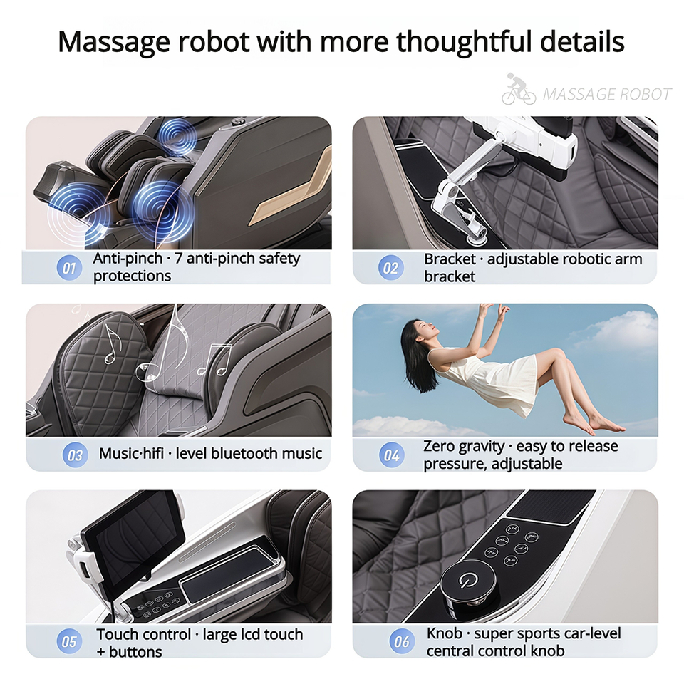 แรงโน้มถ่วงเป็นศูนย์, การสั่นสะเทือน, นวดฝ่าเท้า, การดูแลสุขภาพ, 4d manipulator, sl tracking massage, ประคบร้อน, ควบคุมเสียงอัจฉริยะ, ระบบบลูทูธ, การจัดการระยะไกลของคอมพิวเตอร์