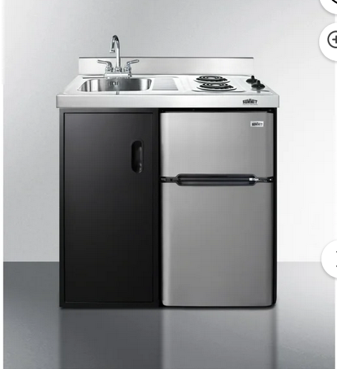 ชุดครัวออลอินวันขนาด 36 นิ้ว พร้อมเตาแก๊ส 2 หัว 115V ตู้เย็น-ช่องแช่แข็ง อ่างล้างจาน และตู้เก็บของ