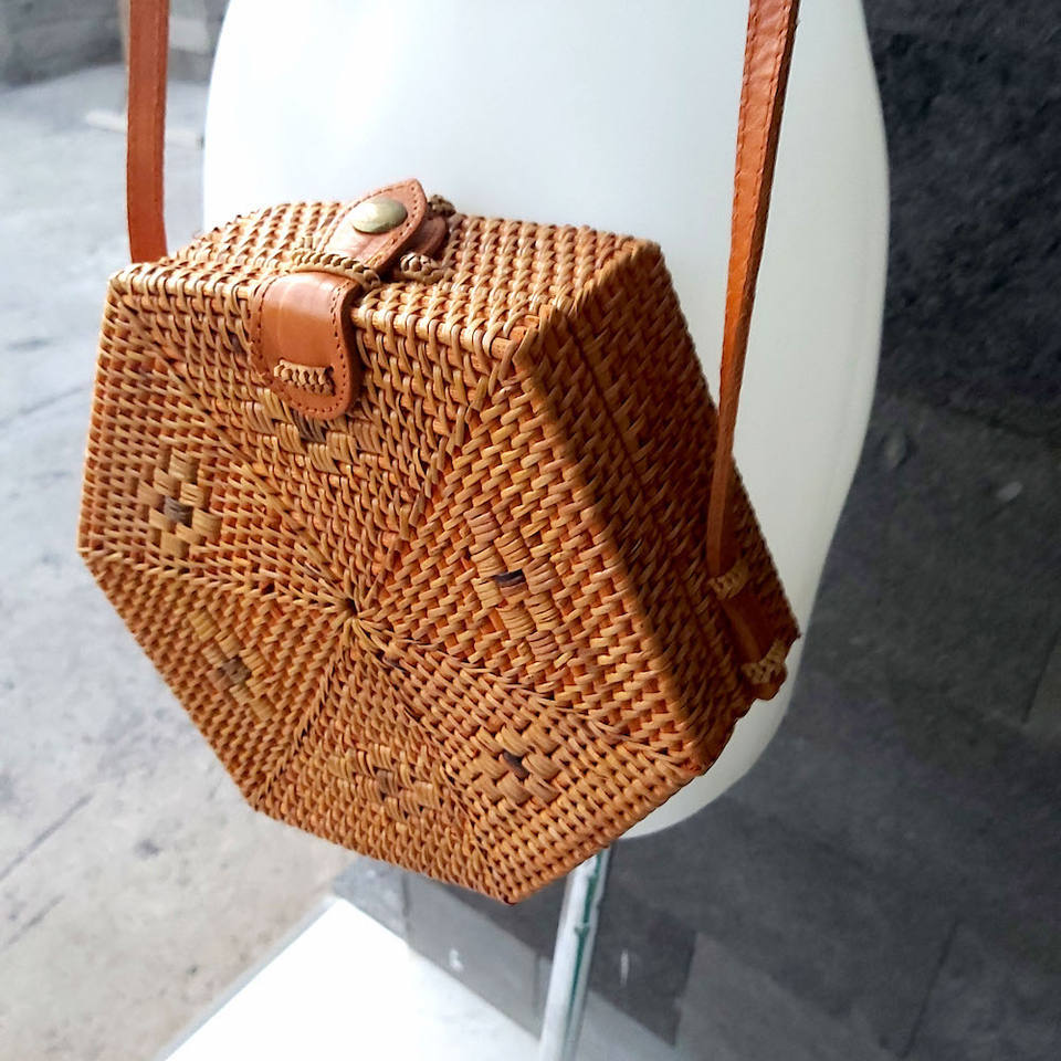 กระเป๋าหวายสานทรงบาหลีแบบดั้งเดิม พร้อมสายหนังเส้นเดียว สีธรรมชาติ กระเป๋าผู้หญิง ผลิตจากพลาสติกอินโดนีเซีย