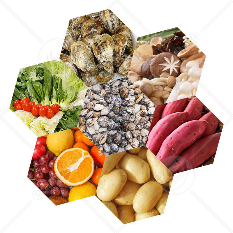 อาหารทะเล, น้ำ, ข้าวโพด, ผลไม้, ผัก, ถั่ววัตถุดิบ
