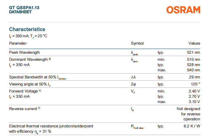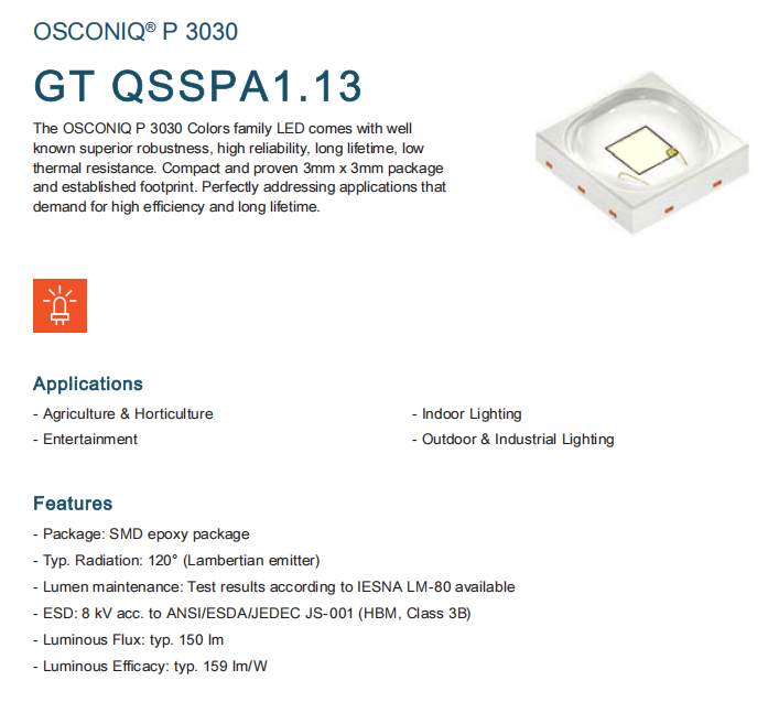 ชิปไฟ LED osconiq P 3030 GT 160LM QSSPA1.13-LRLT-T1T6-1 0.95W 3.7V 525nm สีเขียวพลังงานสูง