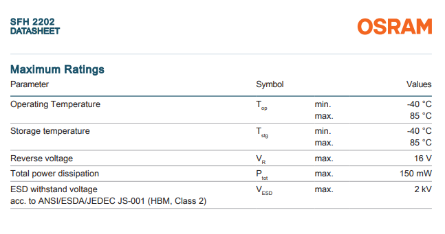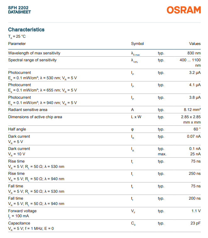 โฟโตไดโอด OSRAM รุ่น SFH 2202 เซ็นเซอร์ 830 นาโนเมตร 2SMD โฟโตไดโอด 830 นาโนเมตร 75 นาโนวินาที 120 ° ชิป LED แบบ 2-SMD