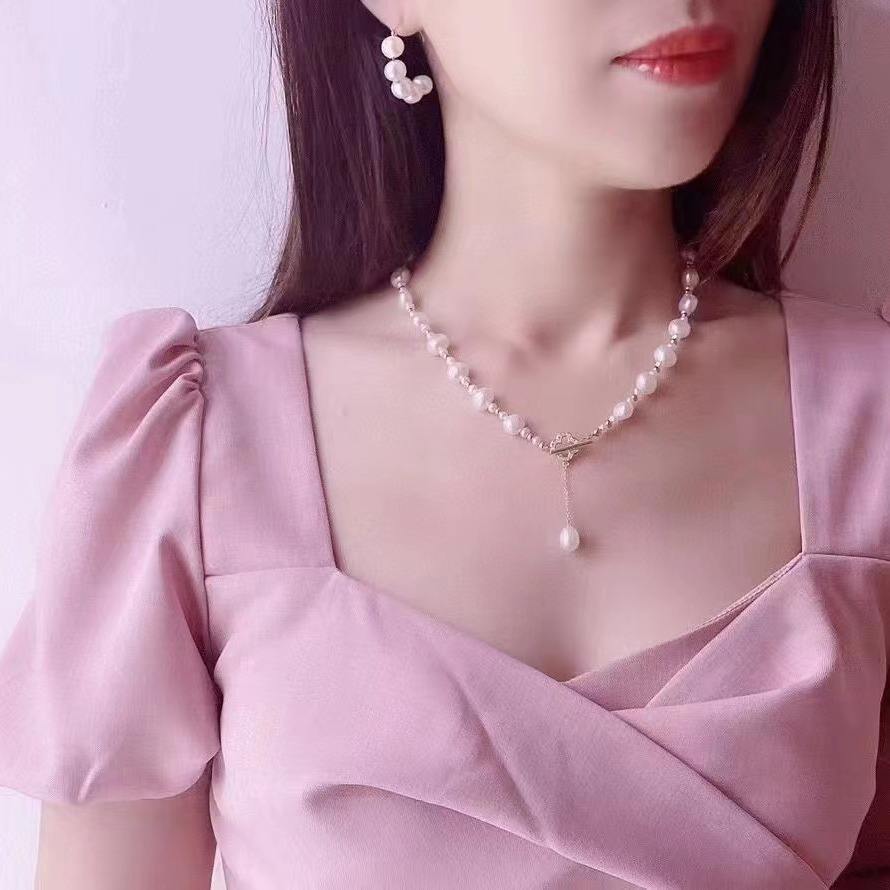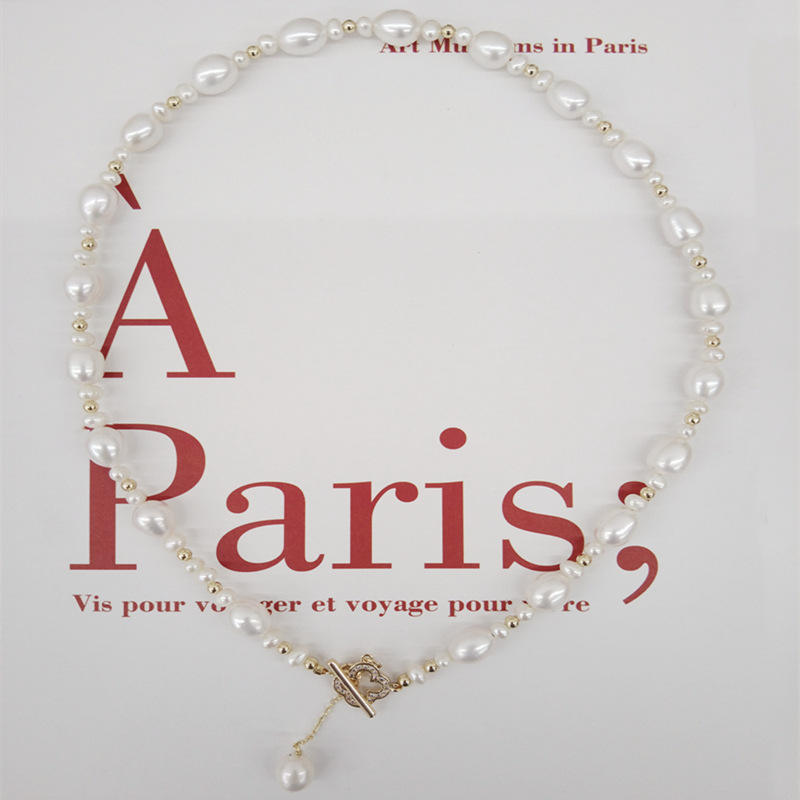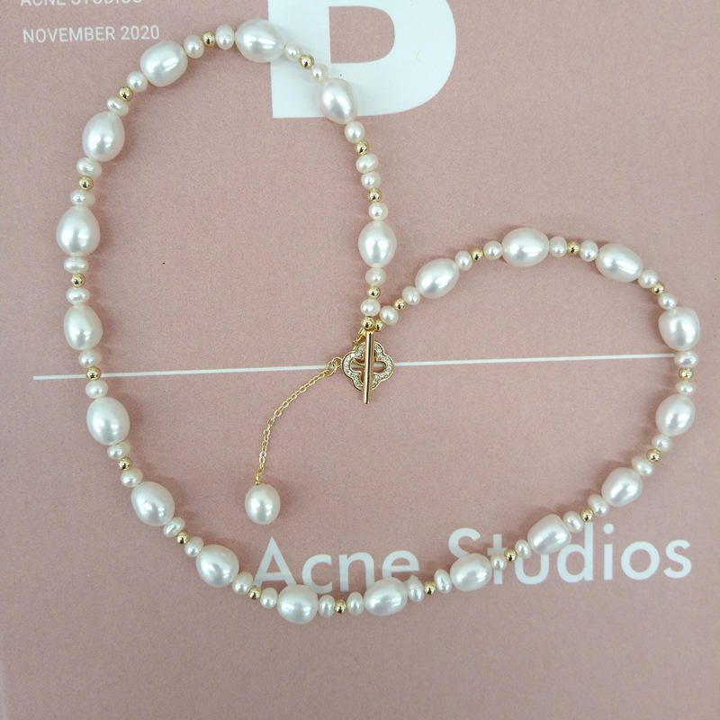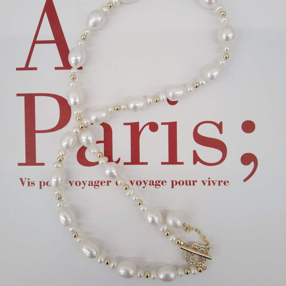 สร้อยคอไข่มุกน้ำจืดแบบเรียบง่าย ดีไซน์ทันสมัย ประดับด้วยไข่มุกทรงข้าว ไข่มุกแท้จากจูจี้ ดีไซน์คลอเวอร์ แบบเรียบหรู ทันสมัย