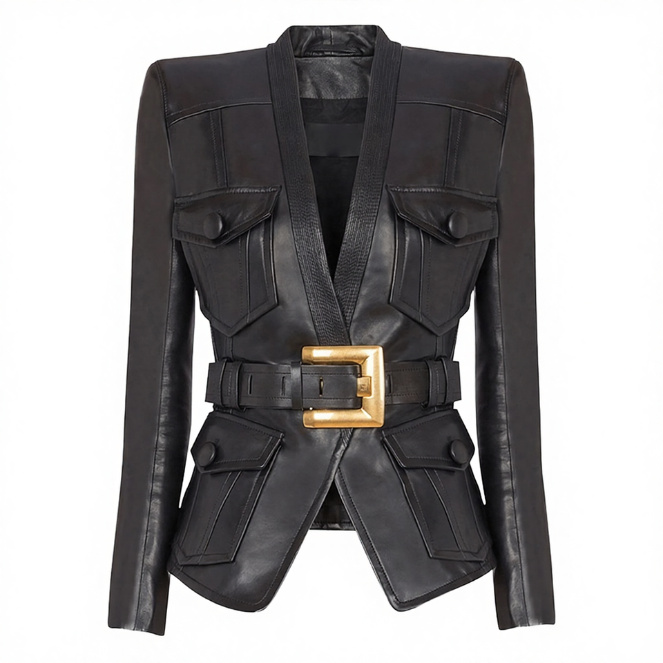 เสื้อแจ็คเก็ตหนัง PU ทอแบบครอป คอวี พร้อมเข็มขัด รุ่น OUDINA Plus Size XXL สำหรับผู้หญิง ใส่ได้ทุกฤดูใบไม้ผลิ ฤดูร้อน ฤดูใบไม้ร่วง ฤดูหนาว เป็นมิตรกับสิ่งแวดล้อม