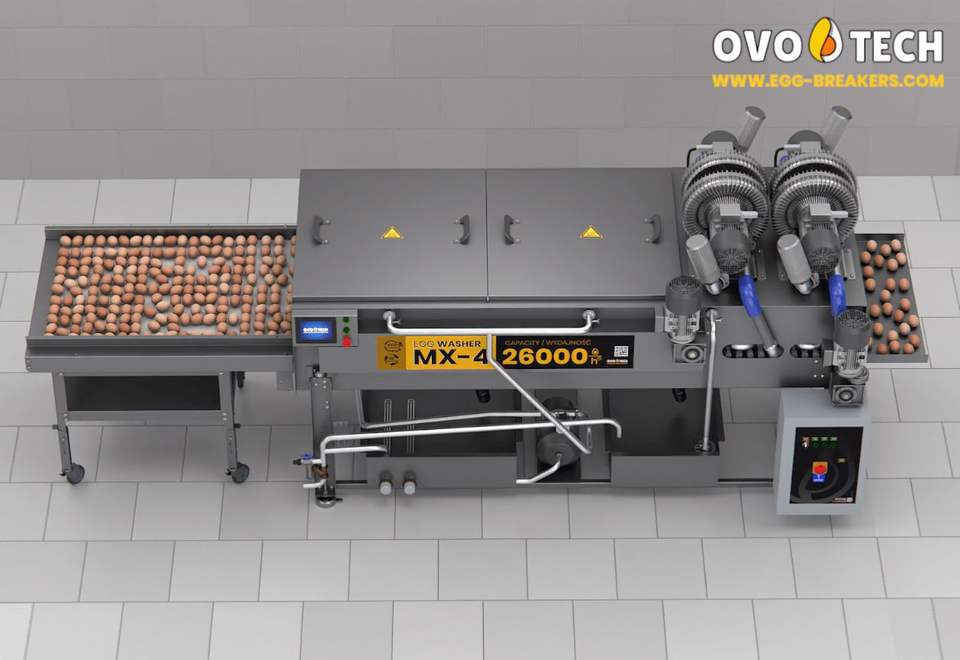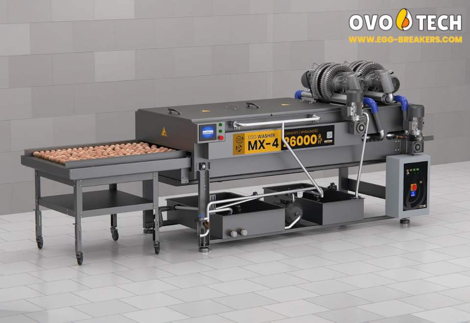 เครื่องล้างไข่เชิงพาณิชย์ OVO-TECH MX-4 โครงสร้างเหล็ก ความจุ 26000 ฟอง/ชั่วโมง ทำความสะอาดและฆ่าเชื้อได้ รับประกัน 1 ปี